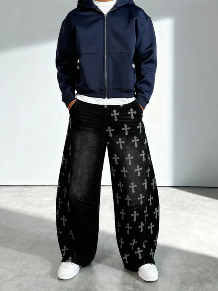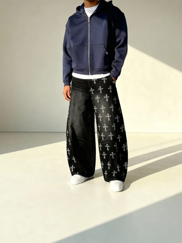 A Hollowcrest entrega presença com elegância: jeans estruturado, caimento impecável e o icônico detalhe Saintry Cross, que cria um visual marcante sem ser exagerado. É resistente, confortável e feita para acompanhar sua rotina com estilo natural.